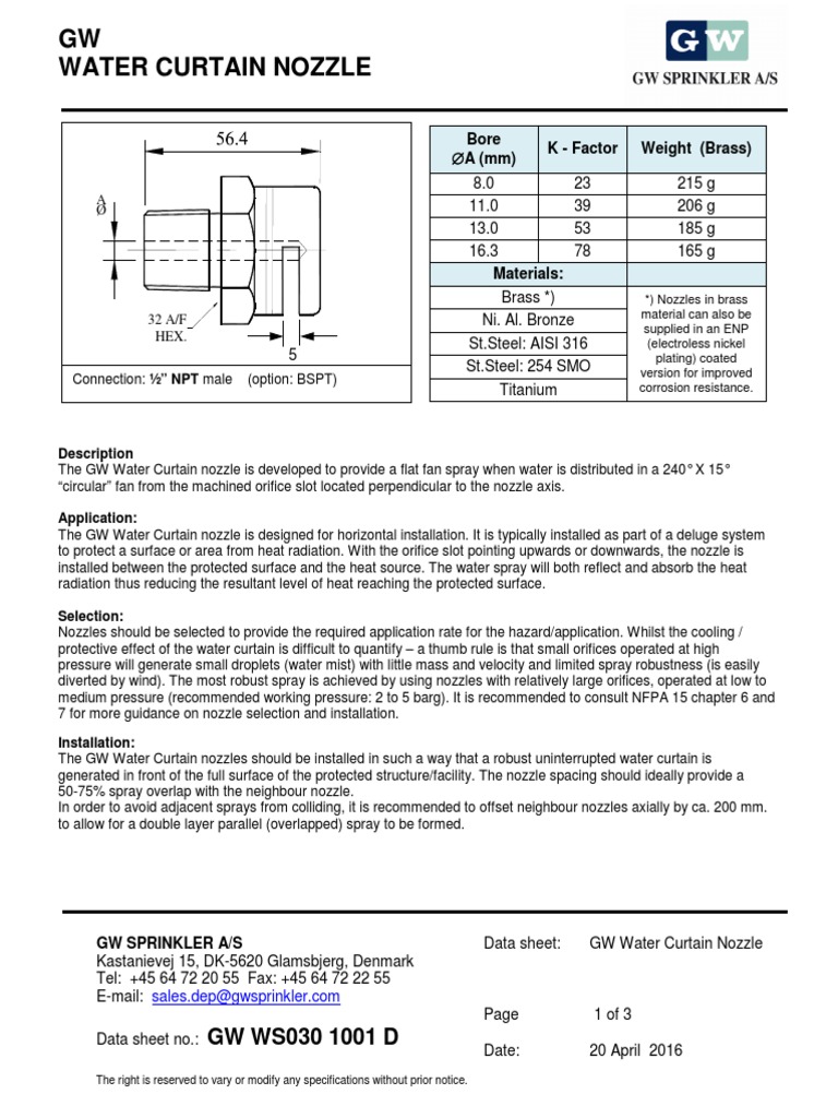 Water curtain nozzle calculation. With the orifice slot pointing upwards or downwards the nozzle is installed between the protected surface and the heat. The gw water curtain nozzle is developed to provide a flat fan spray when water is distributed in a 240 x 15 circular fan from the machined orifice slot located perpendicular to the nozzle axis. Water curtain system is one of the active fire suppression system active fire suppression system means it becomes active only when there is fire. For more information on how to calculate specific gravity contact your local sales person.